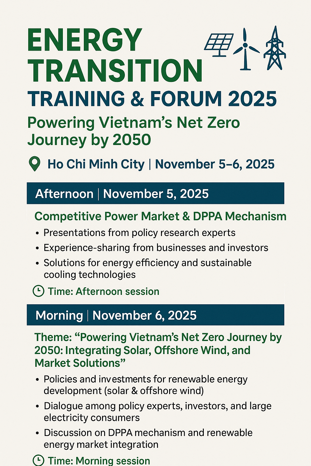Trong khuôn khổ hợp tác với Công ty TNHH Dịch vụ Triển lãm SES Việt Nam (Informa Markets), EAVCED đóng vai trò chủ trì, tổ chức Chương trình đào tạo nâng cao năng lực. Chương trình được thiết kế như một diễn đàn kết nối chính sách – công nghệ – đầu tư, quy tụ cơ quan quản lý, doanh nghiệp, nhà đầu tư và chuyên gia trong lĩnh vực năng lượng nhằm trao đổi, chia sẻ kinh nghiệm và thúc đẩy quá trình chuyển dịch năng lượng tại Việt Nam.